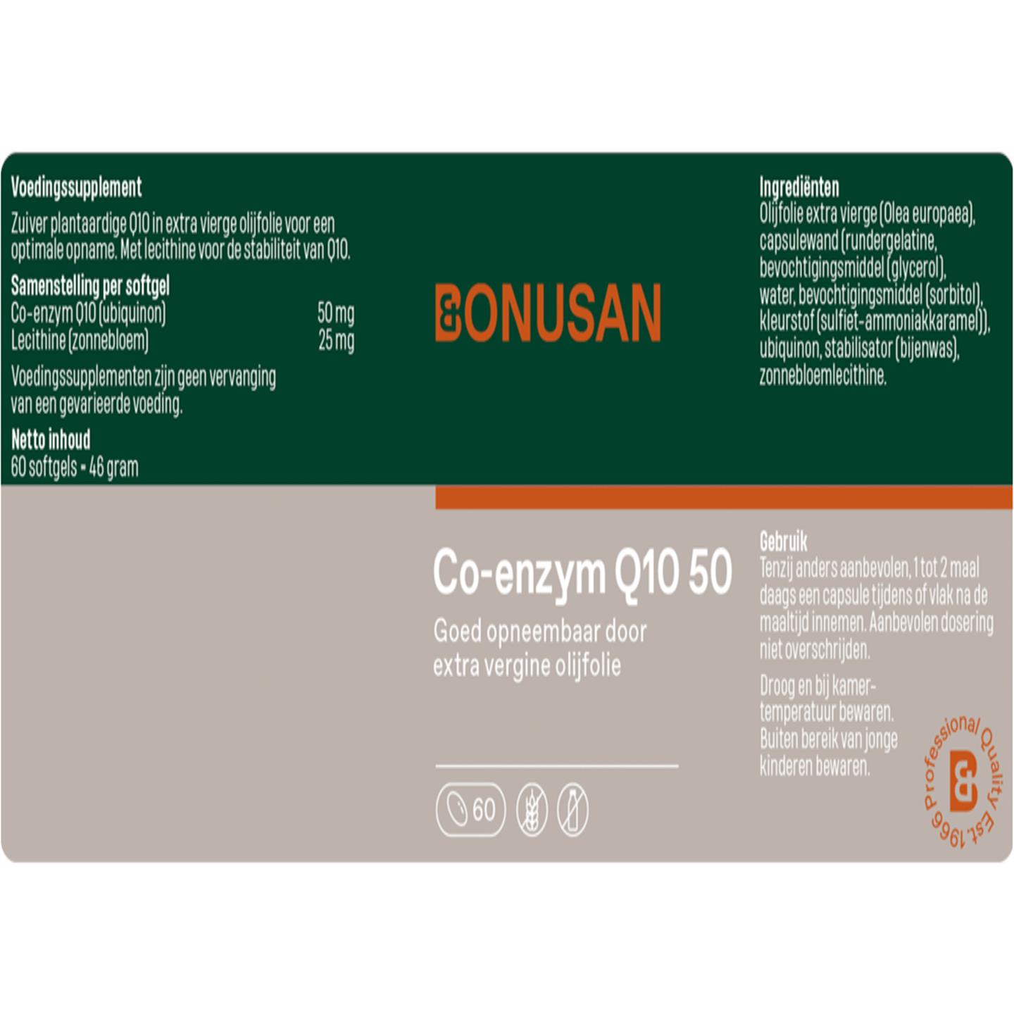 Olijfolie extra vierge (Olea europaea), Capsulewand (Rundergelatine, Bevochtigingsmiddel (glycerol), Water, Bevochtigingsmiddel (sorbitol), Kleurstof (sulfiet-ammoniakkaramel)), Ubiquinon, Stabilisator (Bijenwas), Zonnebloemlecithine.
