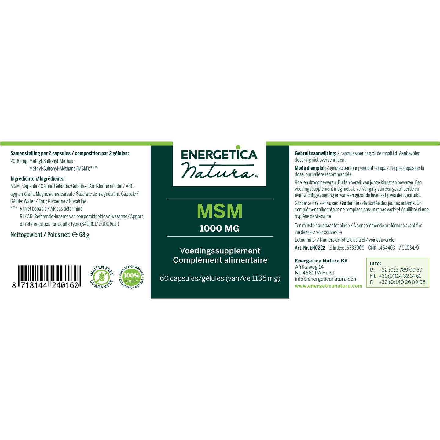 Methyl Sulfonyl Methaan (MSM), Capsule (Gelatine), Antiklontermiddel (Magnesiumstearaat), Capsule (Water, Glycerine).