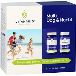 Multi Nacht: Vitaminen (Soja), Mineralen, Vulstof (Microkristallijne cellulose), Mariadistel (Silymarin), DMAE (Dimethyl Amino Ethanol), L-Taurine, Passiebloem extract, Glansmiddel (Hydroxypropylmethylcellulose), Vulstof (Siliciumdioxide), Geconjugeerd linolzuur (Tonalin®), L-Glutathion, Bevochtigingsmiddel (Polysorbaat), Glansmiddelen (Bijenwas, Carnaubawas), Multi Dag: Vitaminen, Mineralen, Antiklontermiddel (Microkristallijne cellulose), Cholinebitartraat, Citrus bioflavonoïden, PABA (para-aminobenzoëzuur), Inositol, OPC (Oligomere proanthocyanidines) druivenpit extract, Antiklontermiddel (Stearinezuur), Glansmiddel (Hydroxypropylmethylcellulose), Antiklontermiddel (Magnesiumstearaat), Vulstof (Siliciumdioxide), Alfa-Liponzuur, Bevochtigingsmiddel (Polysorbaat), Glansmiddelen (Bijenwas, Carnaubawas).