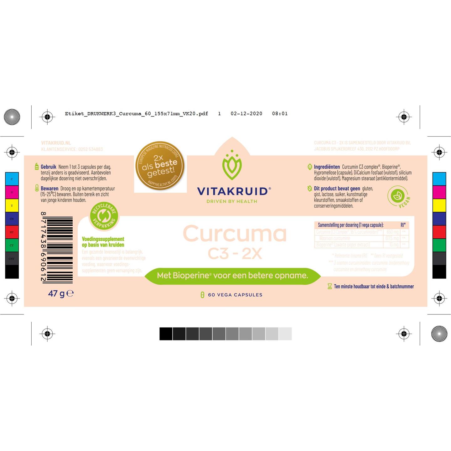 Curcumine (C3 complex®), Bioperine® (Zwarte peper extract), Capsule (Hypromellose), Vulstoffen (Dicalciumfosfaat, Siliciumdioxide), Antiklontermiddel (Magnesiumstearaat).