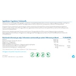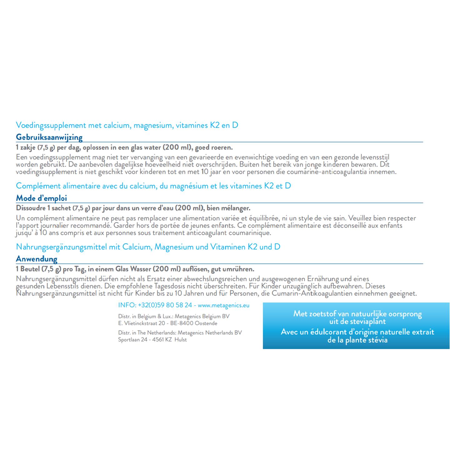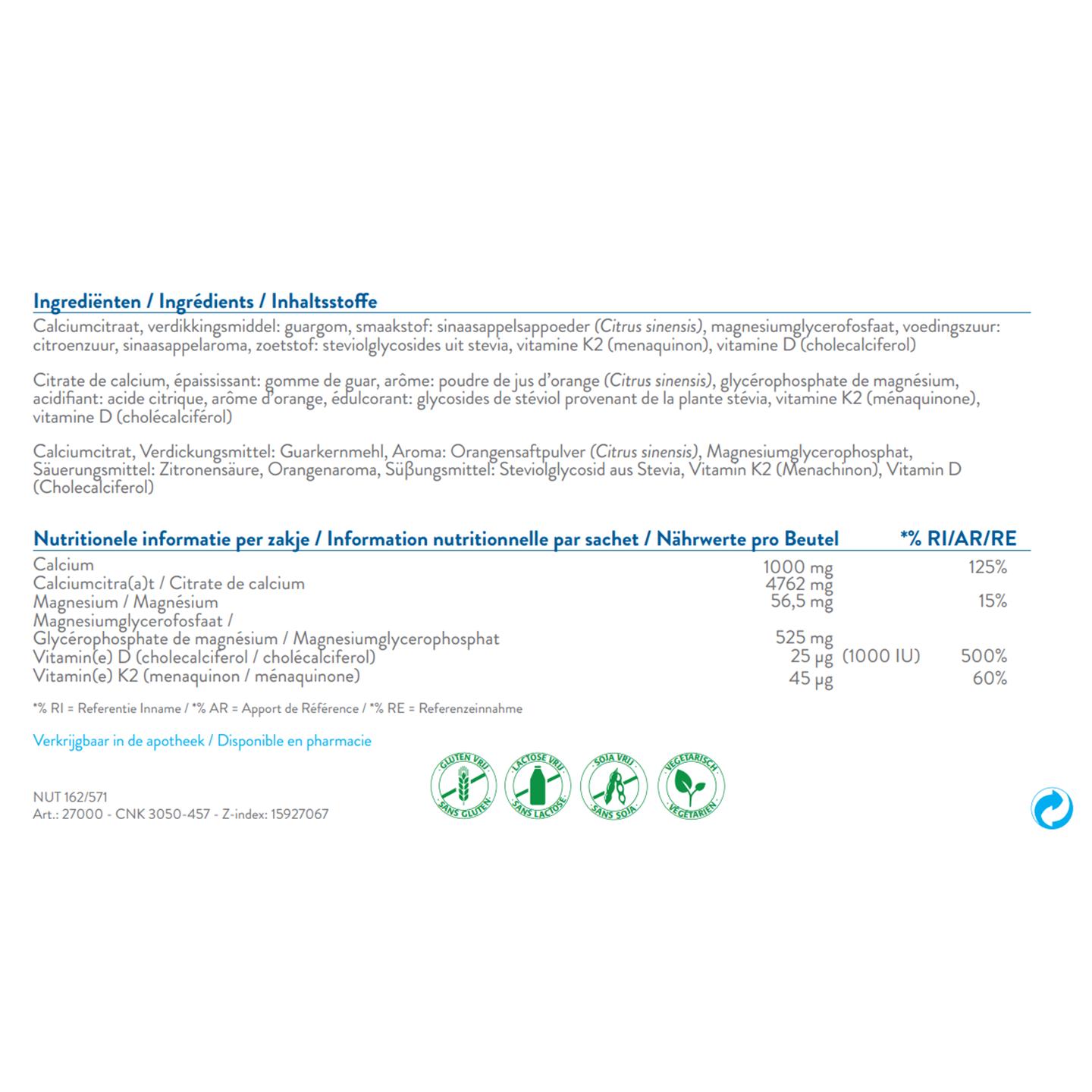 Calciumcitraat, Verdikkingsmiddel (Guargom), Smaakstof (Sinaasappelsap poeder (Citrus sinensis)), Magnesiumglycerofosfaat, Voedingszuur (Citroenzuur), Sinaasappel aroma, Zoetstof (Steviolglycosides uit stevia), Vitamine K2 (menaquinon), Vitamine D (cholecalciferol).