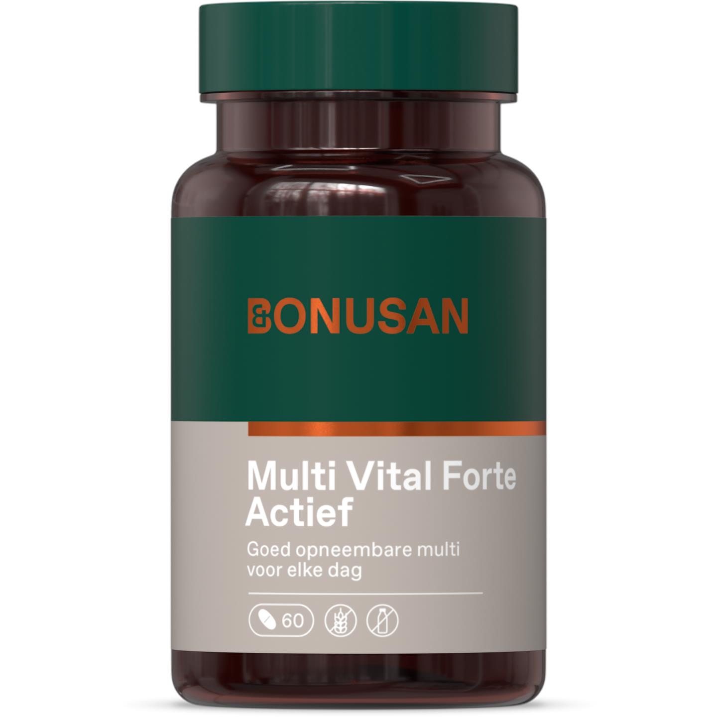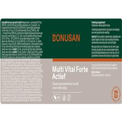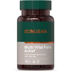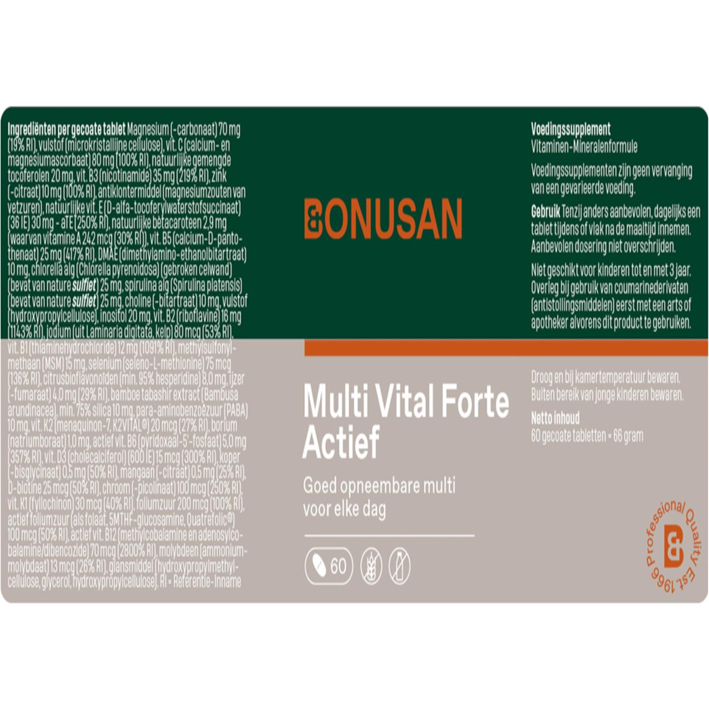 Magnesium (carbonaat), Vulstof (Microkristallijne cellulose), Vitamine C (calcium- en magnesiumascorbaat), Natuurlijke gemengde tocoferolen, Vitamine B3 (nicotinamide), Zink (citraat), Antiklontermiddel (Magnesiumzouten van vetzuren), Natuurlijke vitamine E (D-alfa-tocoferylwaterstofsuccinaat), Natuurlijke bètacaroteen, Vitamine B5 (calcium-d-pantothenaat), DMAE (dimethylamino-ethanolbitartraat), Chlorella alg (Chlorella pyrenoidosa) (gebroken celwand) (bevat van nature sulfiet) (Sulfiet), Spirulina alg (Spirulina platensis) (bevat van nature sulfiet) (Sulfiet), Choline (bitartraat), Vulstof (Hydroxypropylcellulose), Inositol, Vitamine B2 (riboflavine), Jodium (uit Laminaria digitata, kelp), Vitamine B1 (thiaminehydrochloride), Methylsulfonylmethaan (MSM), Selenium (seleno-l-methionine), Citrusbioflavonoïden, IJzer (fumaraat), Bamboe tabashir extract (Bambusa arundinacea), Para-aminobenzoëzuur (PABA), Vitamine K2 (menaquinon-7, K2Vital®), Borium (natriumboraat), Actief vitamine B6 (pyridoxaal-5-fosfaat), Vitamine D3 (cholecalciferol), Koper (bisglycinaat), Mangaan (citraat), D-Biotine, Chroom (picolinaat), Vitamine K1 (fyllochinon), Foliumzuur, Actief foliumzuur (folaat, 5MTHF-glucosamine, Quatrefolic®), Actief vitamine B12 (methylcobalamine en adenosylcobalamine/dibencozide), Molybdeen (ammoniummolybdaat), Glansmiddel (Hydroxypropylmethylcellulose).