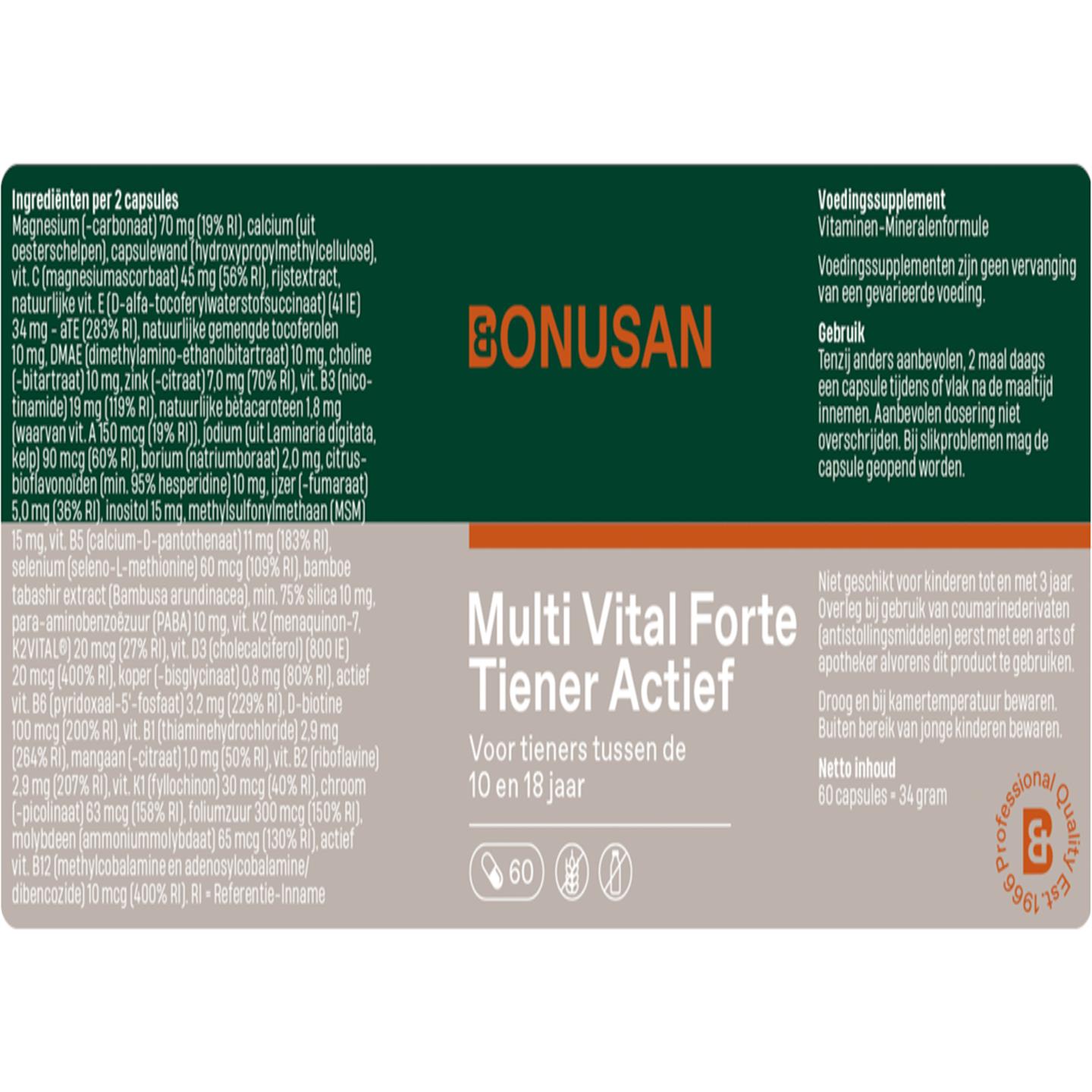 Magnesium (carbonaat), Calcium (uit oesterschelpen), Capsulewand (Hydroxypropylmethylcellulose), Vitamine C (magnesiumascorbaat), Rijstextract, Natuurlijke vitamine E (D-alfa-tocoferylwaterstofsuccinaat), Natuurlijke gemengde tocoferolen, DMAE (dimethylamino-ethanolbitartraat), Choline (bitartraat), Zink (citraat), Vitamine B3 (nicotinamide), Natuurlijke bètacaroteen, Jodium (uit Laminaria digitata, kelp), Borium (natriumboraat), Citrusbioflavonoïden, IJzer (fumaraat), Inositol, Methylsulfonylmethaan (MSM), Vitamine B5 (calcium-d-pantothenaat), Selenium (seleno-l-methionine), Bamboe tabashir extract (Bambusa arundinacea), Para-aminobenzoëzuur (PABA), Vitamine K2 (menaquinon-7, K2Vital®), Vitamine D3 (cholecalciferol), Koper (bisglycinaat), Actief vitamine B6 (pyridoxaal-5-fosfaat), D-Biotine, Vitamine B1 (thiaminehydrochloride), Mangaan (citraat), Vitamine B2 (riboflavine), Vitamine K1 (fyllochinon), Chroom (picolinaat), Foliumzuur, Molybdeen (ammoniummolybdaat), Actief vitamine B12 (methylcobalamine en adenosylcobalamine/dibencozide).
