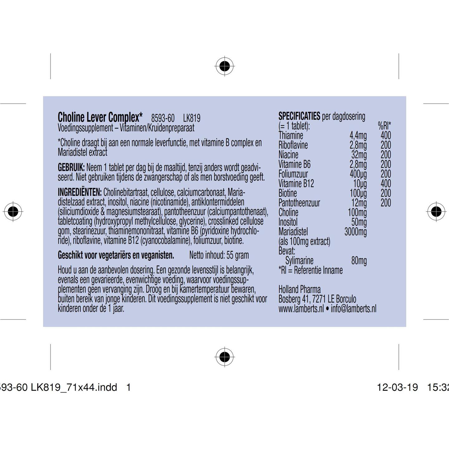 Cholinebitartraat, Cellulose, Calciumascorbaat, Mariadistelzaad extract, Inositol, Vitamine B3 (niacine, nicotinamide), Antiklontermiddelen (Siliciumdioxide, Magnesiumstearaat), Vitamine B5 (calciumpantothenaat, pantotheenzuur), Tabletcoating (Hydroxypropylmethylcellulose, Glycerine), Cross-linked cellulosegom, Stearinezuur, Vitamine B1 (thiaminemononitraat), Vitamine B6 (pyridoxine HCl), Vitamine B2 (riboflavine), Vitamine B12 (cyanocobalamine), Foliumzuur, Biotine.