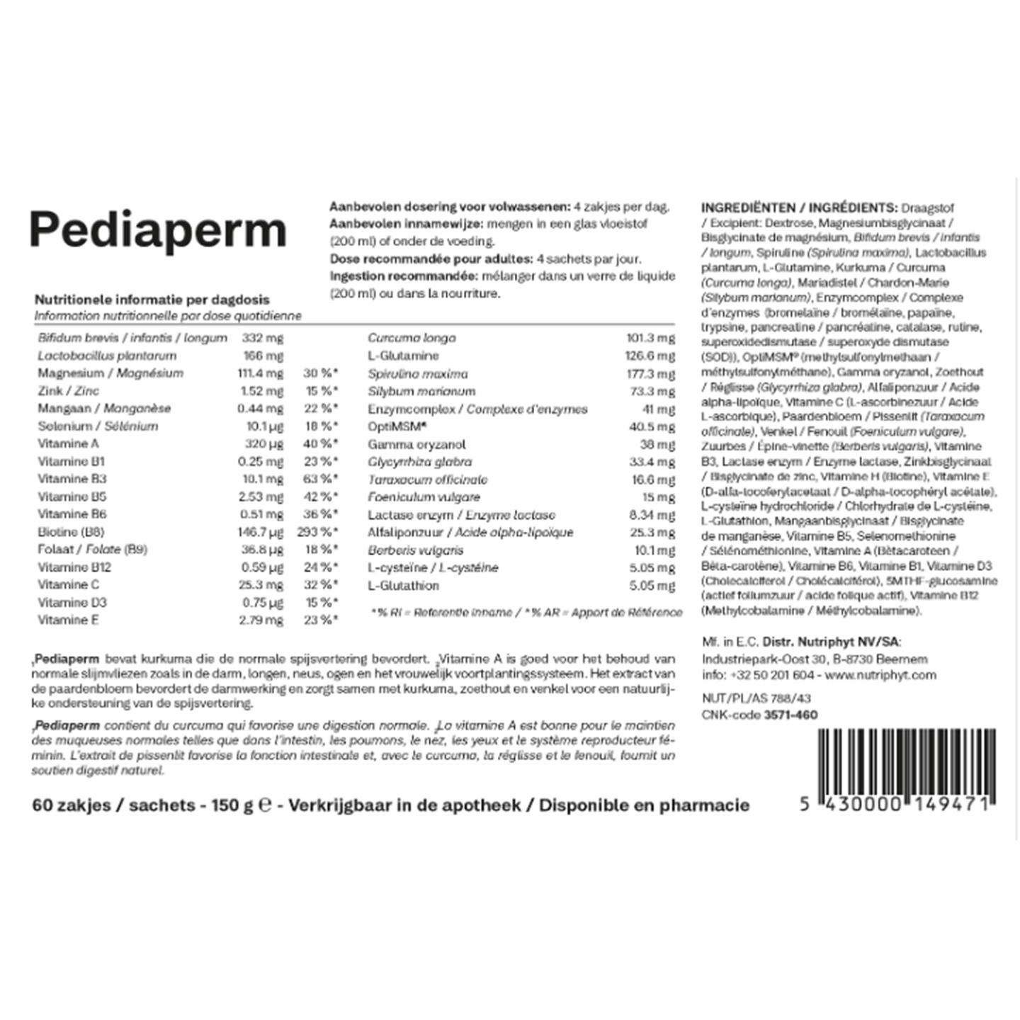 Volwassenen: 4 zakjes per dag, tenzij anders voorgeschreven door arts of therapeut. Mengen in een glas vloeistof (200 milliliter) of onder de voeding. De aanbevolen dagdosering niet overschrijden.