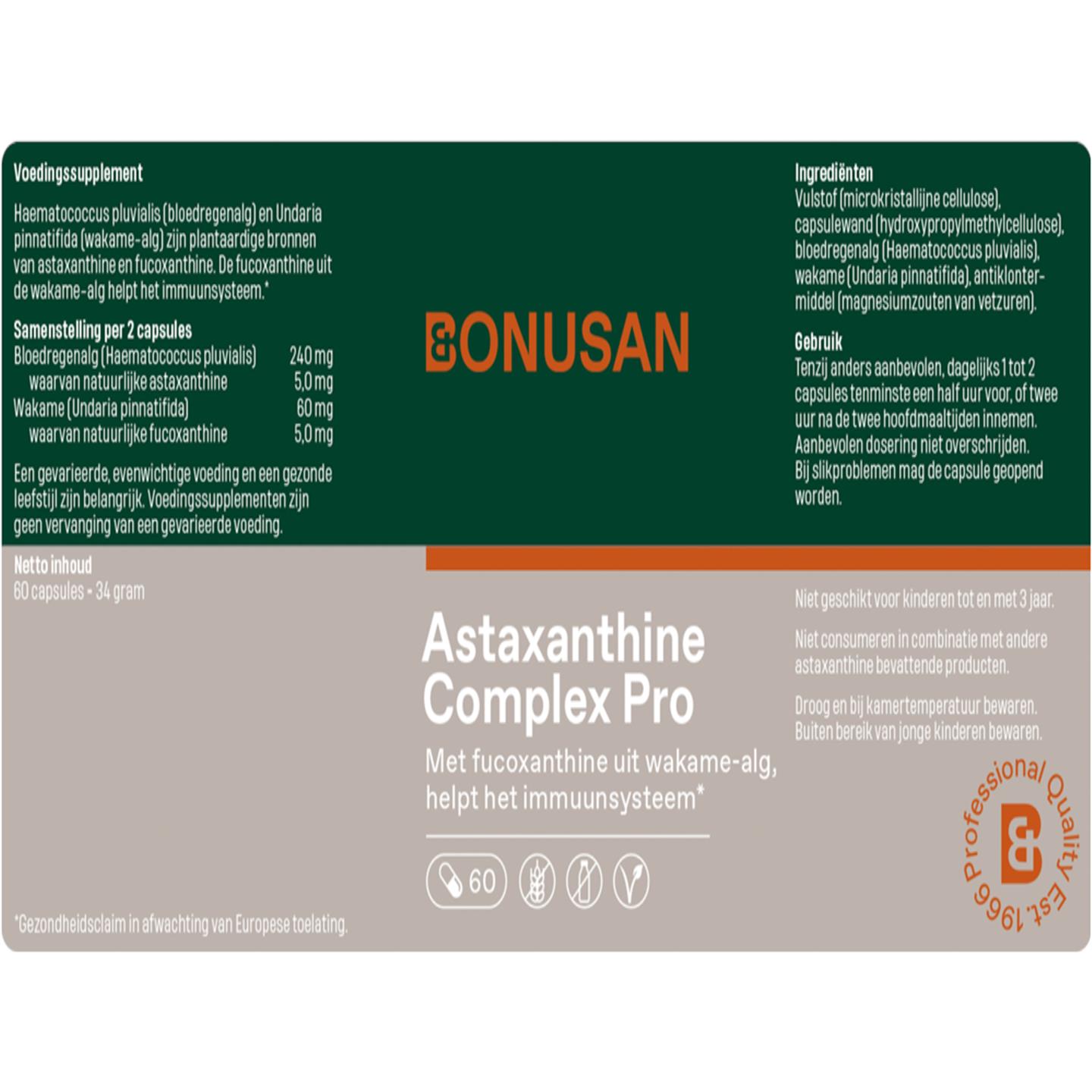 Vulstof (Microkristallijne cellulose), Capsulewand (Hydroxypropylmethylcellulose), Bloedregenalg (Haematococcus pluvialis), Wakame (Undaria pinnatifida), Antiklontermiddel (Magnesiumzouten van vetzuren).