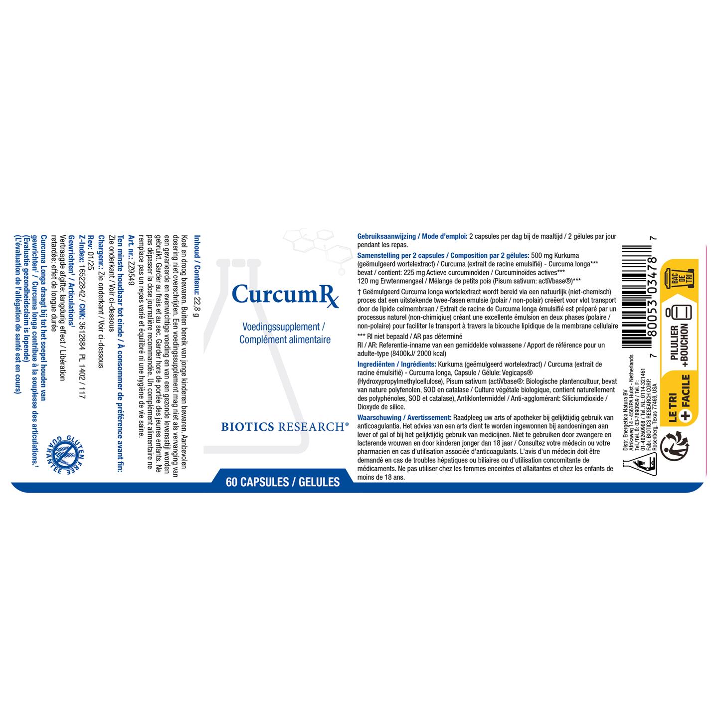 Kurkuma (Curcuma longa) (geëmulgeerd wortelextract), Capsule: Vegicaps® (Hydroxypropylmethylcellulose), Pisum sativum (actiVbase®: Biologische plantencultuur, bevat van nature polyfenolen, SOD en catalase), Antiklontermiddel (Siliciumdioxide).